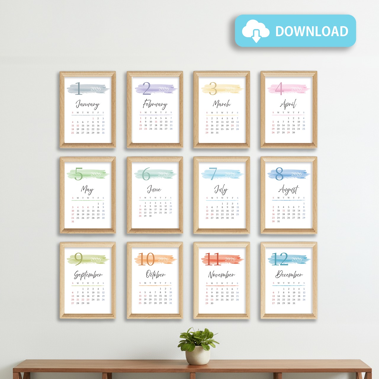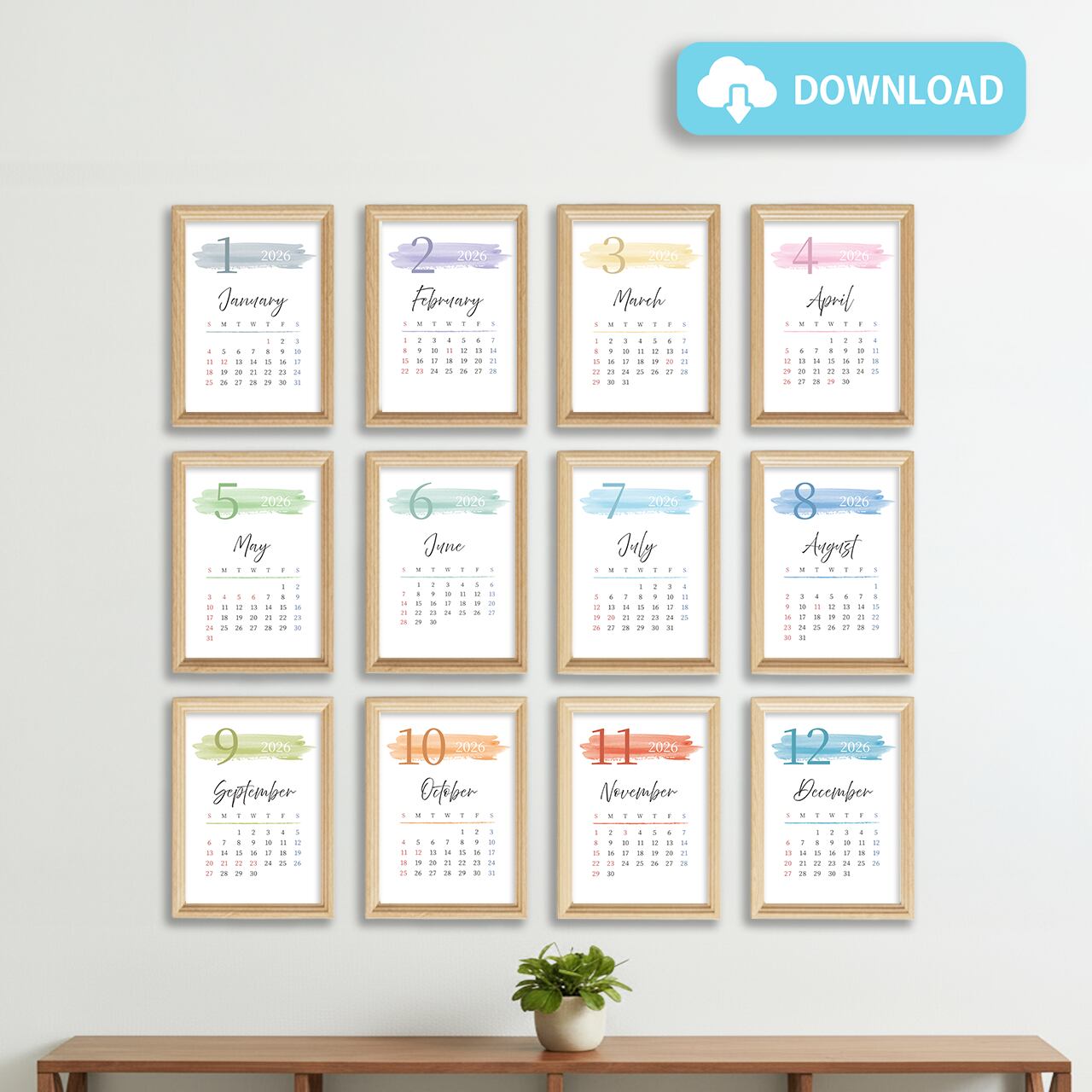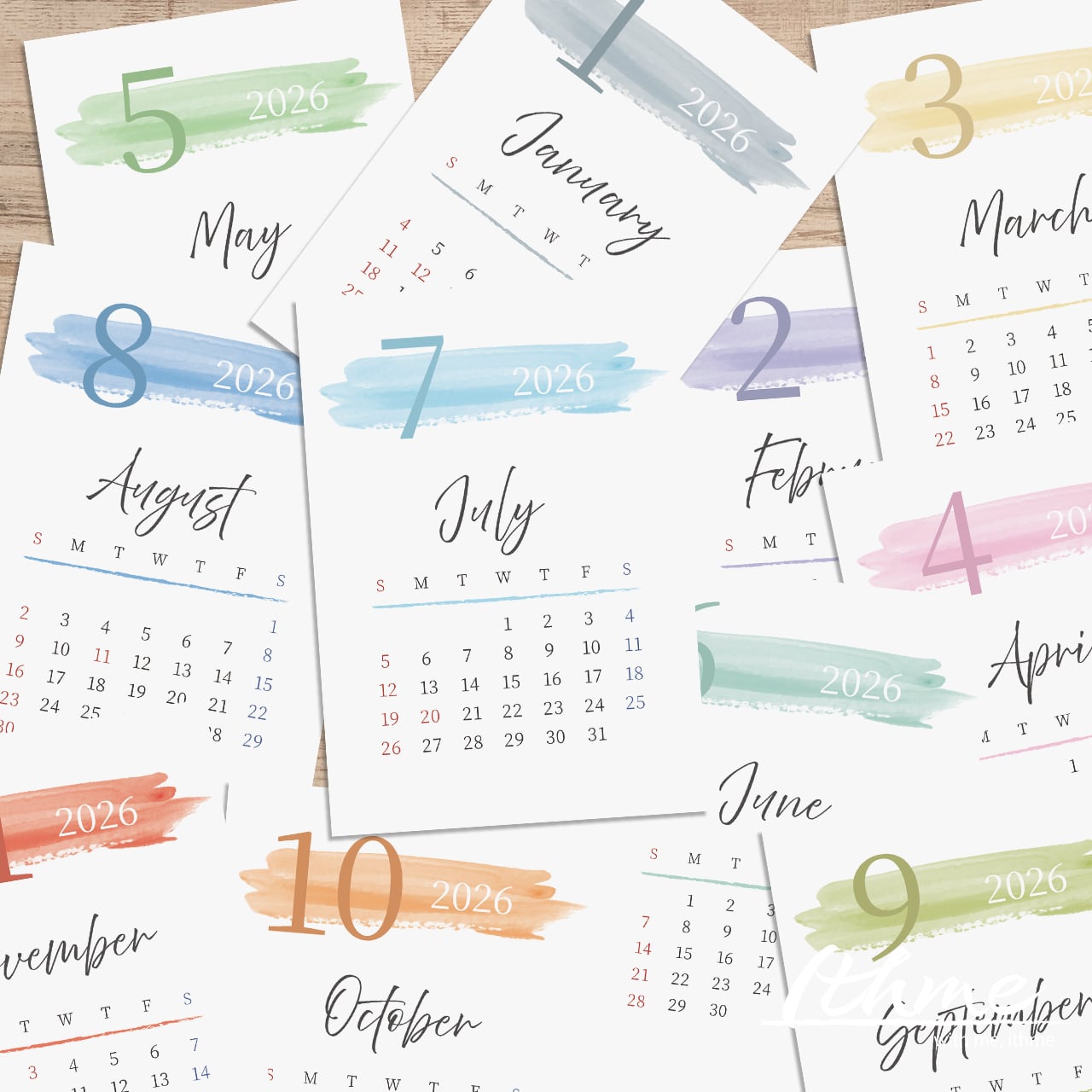 2026年 カレンダー 印刷 プリント データ販売 デジタル ダウンロード シンプル ボーダー ストライプ 卓上 12か月 カラフル