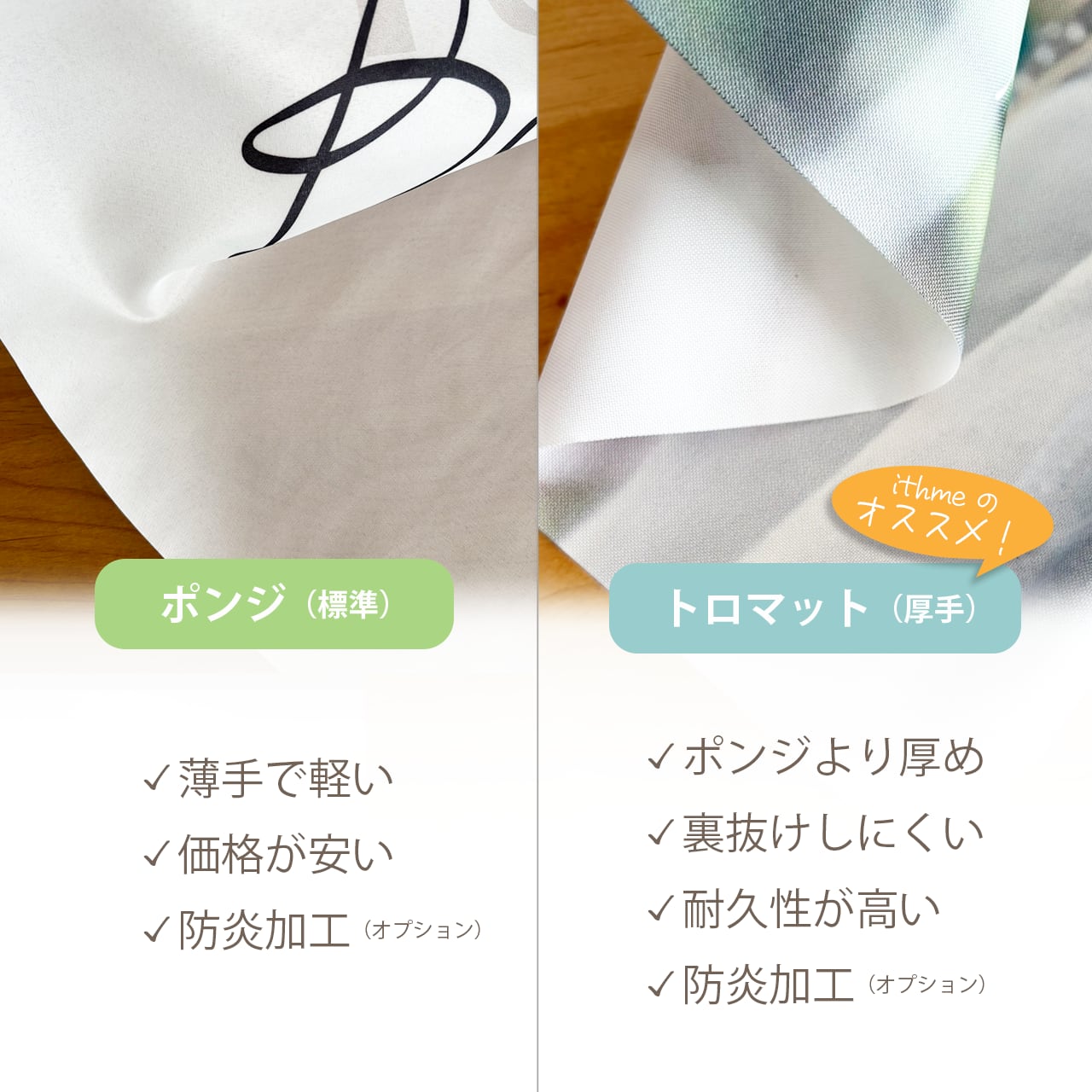 ▶布生地は、薄手の「ポンジ」 / 厚手の「トロマット」をご用意しています。