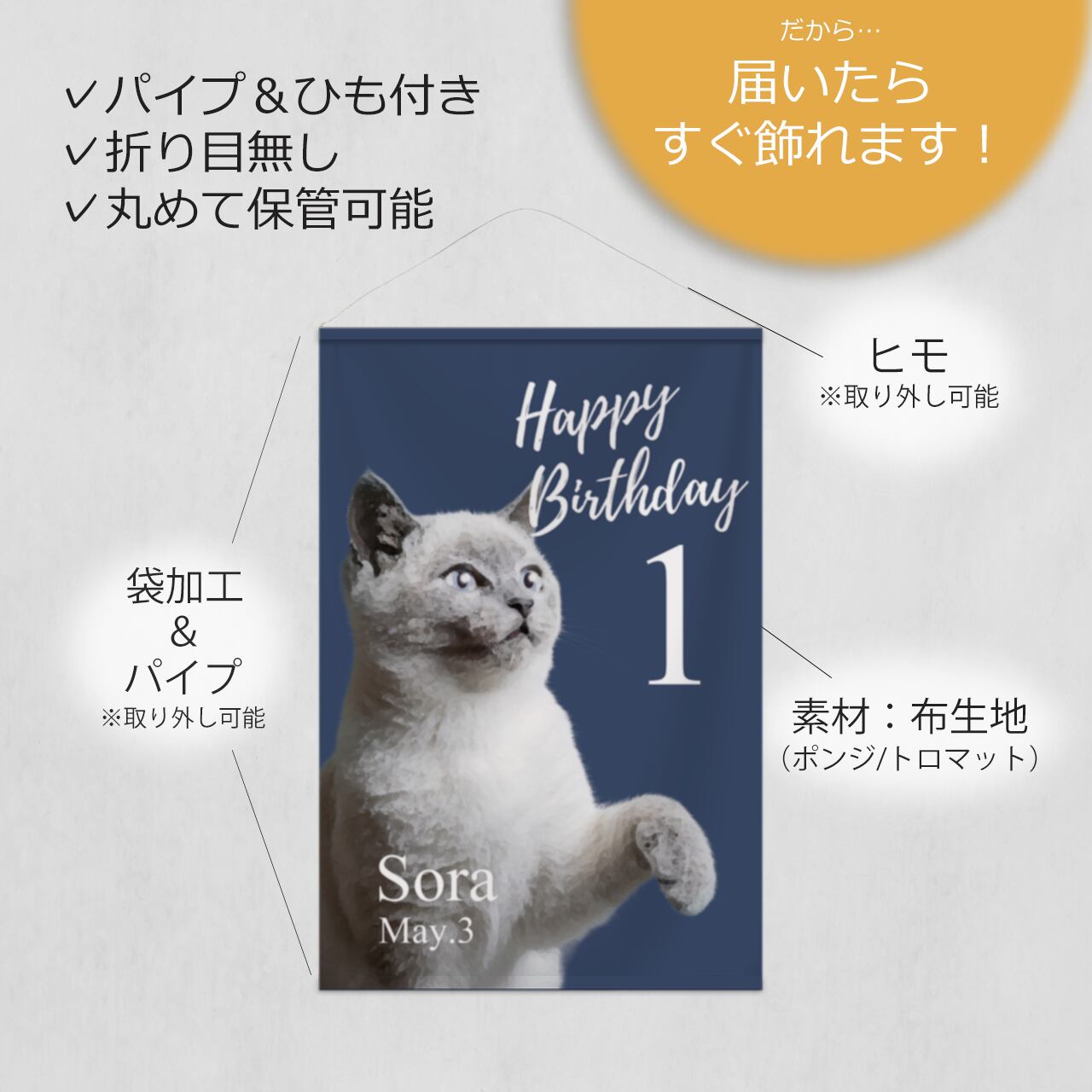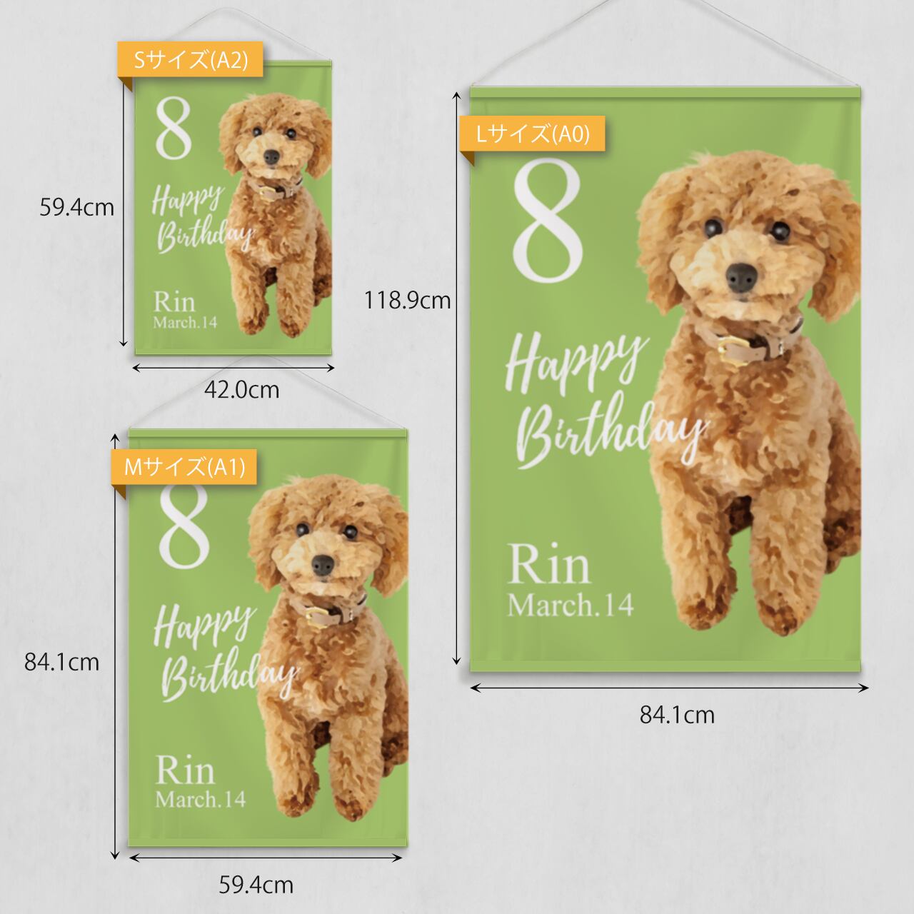 ペット 犬 猫 ポスター 誕生日 バースデー イラスト お祝い ディスプレイ タペストリー パーティー ウェルカムスペース ウェルカムボード ウェルカムサイン フォトブース 看板 布印刷 オリジナル セミオーダー カスタマイズ 名入れ