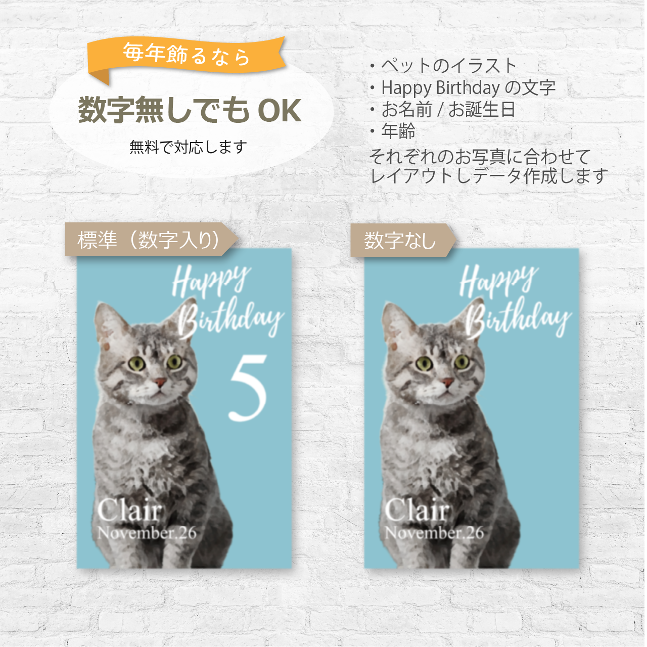 ▶ペットのお写真をお預かりしイラスト風に加工&お名前・誕生日・年齢を表す数字をそれぞれに合うように配置しデザインします
